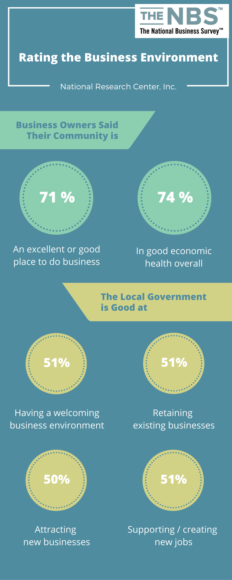 Research indicates that the economic health of the community entire is tied to the health of its business environment, and that small businesses especially need the support of their respective communities to thrive. Data from several different U.S. jurisdictions who have participated in The National Business SurveyTM by National Research Center, Inc. show that 71 percent of business owners in general view their city as a good place to do business and that 74 percent of business owners perceive their city to be economically healthy overall. These perceptions are a major consideration for where small business owners choose to locate themselves.