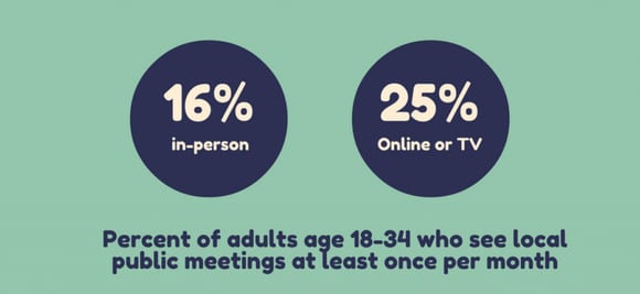 According to NRC data, only 16 percent of younger adults said they had attended local public meetings in-person at least once per month. However, one-fourth of them reported that they watch local public meetings online or on television. As recorded meetings can be viewed at any time, it comes as no surprise that significantly more Millennials – who are busy with school and/or work – choose to catch up on local public meetings online.