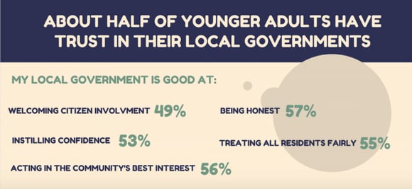 If lack of awareness is indeed the first stumbling block toward public trust, local governments can take the first steps to smoothing the road. The data show that Millennials (and people of all generations) want to connect with their community leaders, and they may be looking to their local governments to engage with them in a way they find more accessible. Those jurisdictions that innovate, experiment and communicate will inevitably find success not only in connecting with their residents, but in nudging the needle toward better public trust.