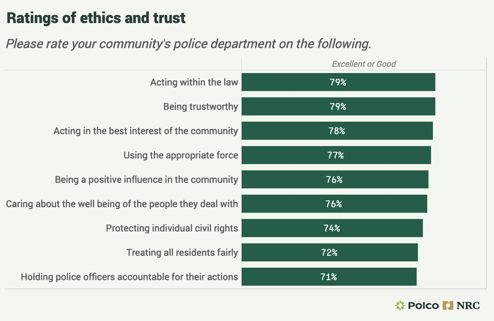 Most residents also trust their law enforcement agencies. Three-fourths of residents positively rate issues such as acting in the best interest of the community, acting within the law, being a positive influence in the community and using appropriate force.