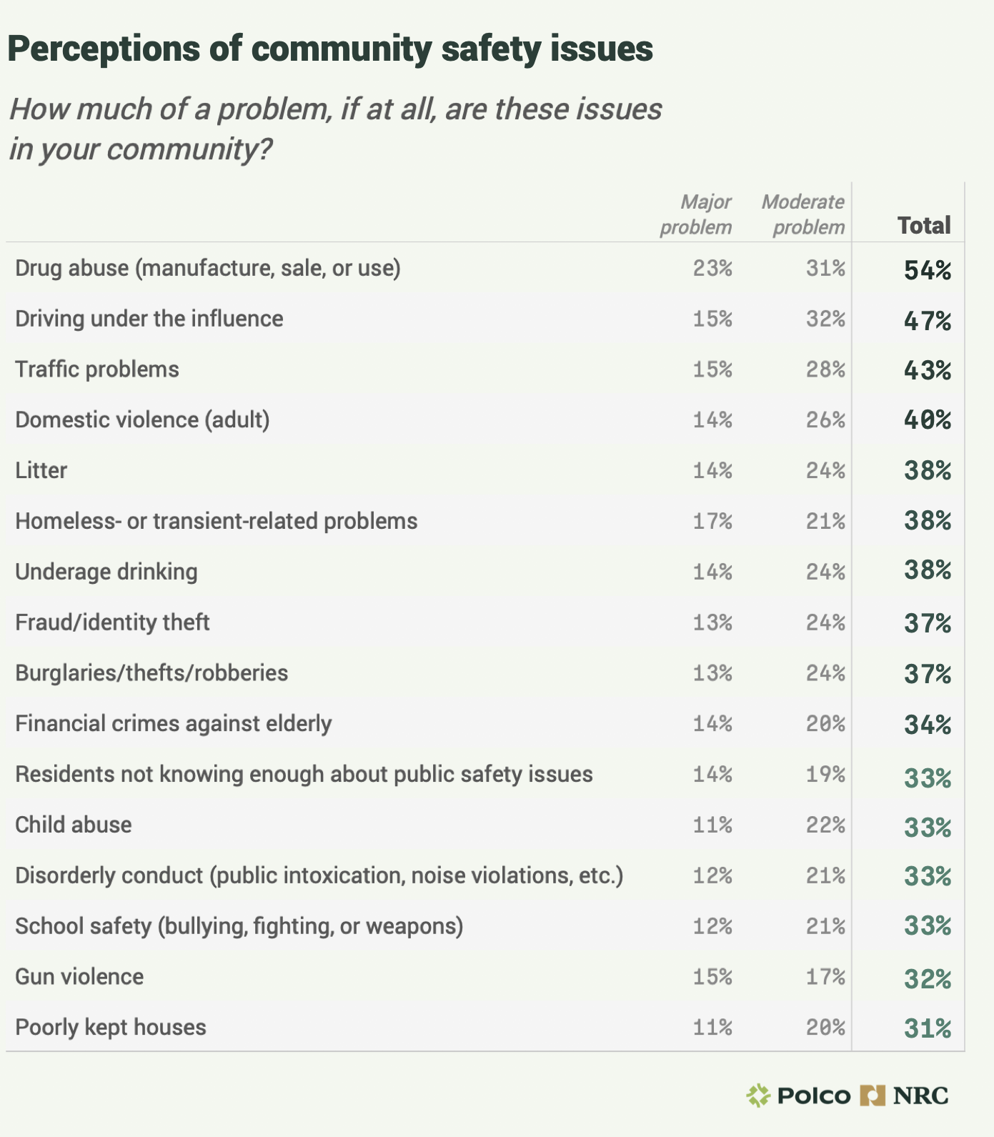 While most people feel safe, every community has some concerns regarding public safety. According to research, most residents consider drug abuse and driving under the influence the preeminent problems in their community. Residents also say they are highly concerned about traffic, domestic violence, homelessness, litter and burglaries.
