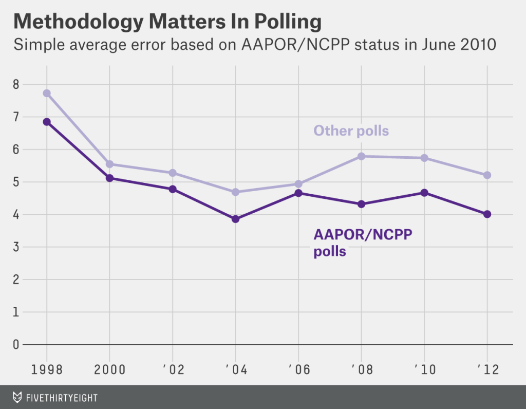 Nate Silver, the polling guru, published the study comparing the track record of ‘transparent’ polling firms to those that were not members of the AAPOR TI (or another organization whose members are expected to show high standards in polling, National Council on Public Polls (NCPP). Remarkably, transparent polls have made better voting predictions not only recently, but since the study date’s onset in 1998. (See chart below)