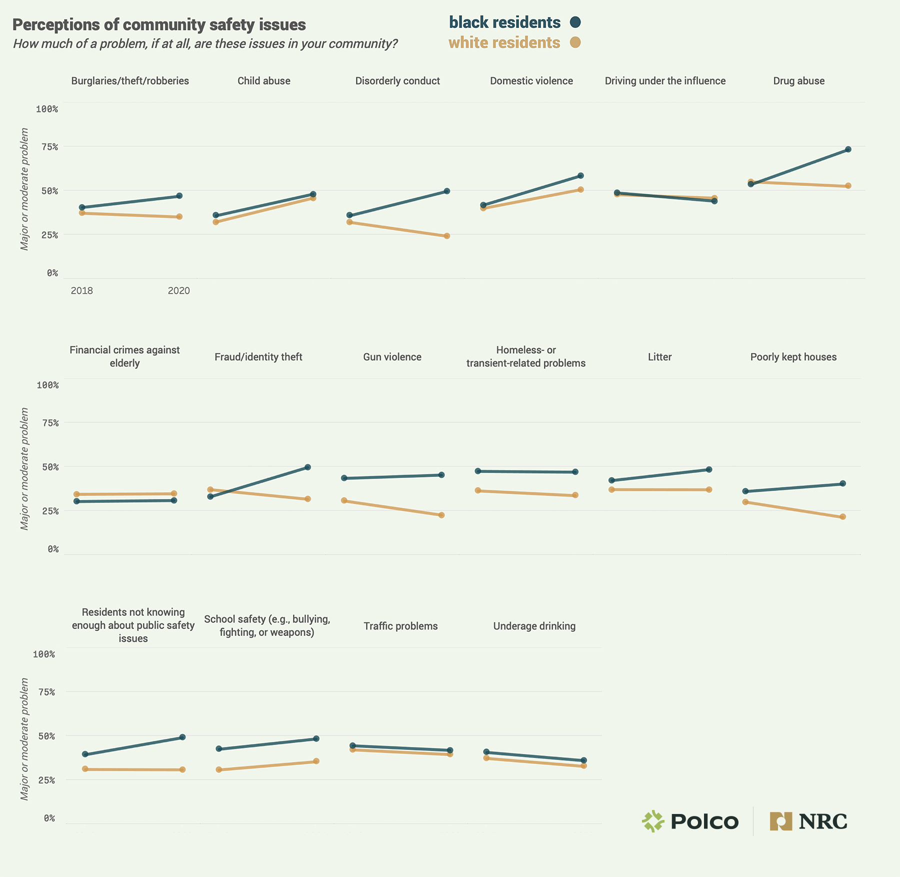 Both studies ask residents how much of a problem various crimes or issues are in their communities. In 2018, black and white residents agreed much more closely on those issues than in 2020.
