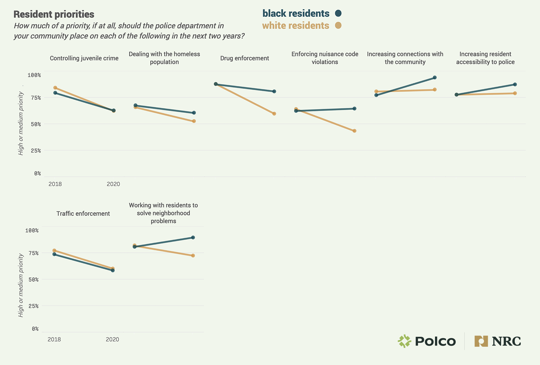 In 2018, black and white residents aligned more closely on the importance of issues such as school safety, drug enforcement, working with residents to solve neighborhood problems and more.